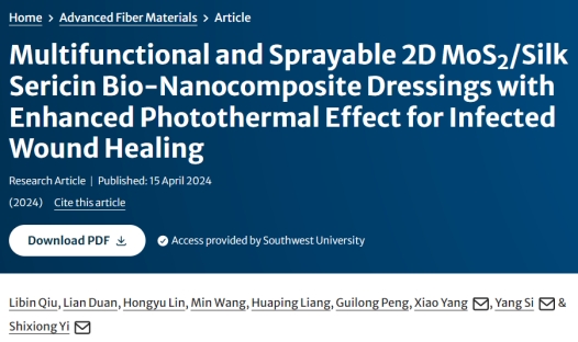 发布时间: 2024-04-17 13:22:58 已阅读:2024年4月16日,第一版主 易世雄副教授团队在纺织材料学科领域1区Top期刊Advanced Fiber Materials(影响因子16.1)上在线发表题为“Multifunctional and Sprayable 2D MoS2/Silk Sericin Bio‑Nanocomposite Dressings with Enhanced Photothermal Effect for Infected Wound Healing”的研究论文。这是易世雄团队继开发基于丝素蛋白的静电混纺吸附膜材料在该期刊上发表高水平研究论文后的又一重要成果。
