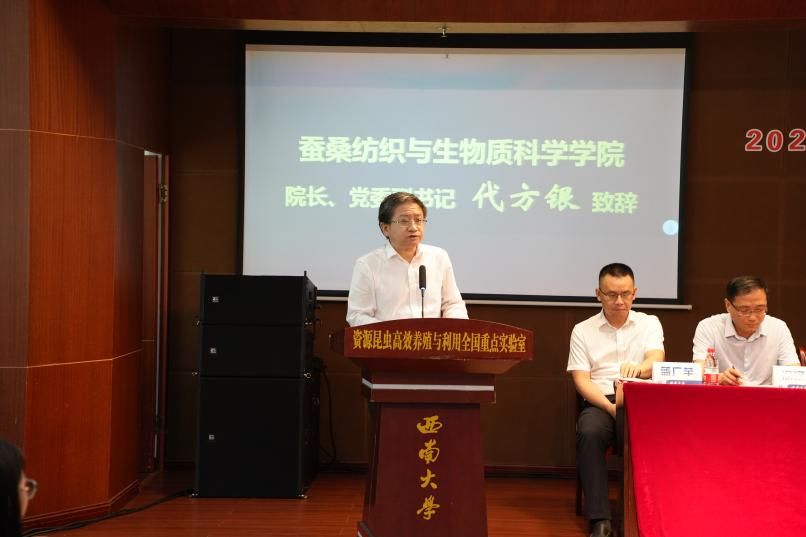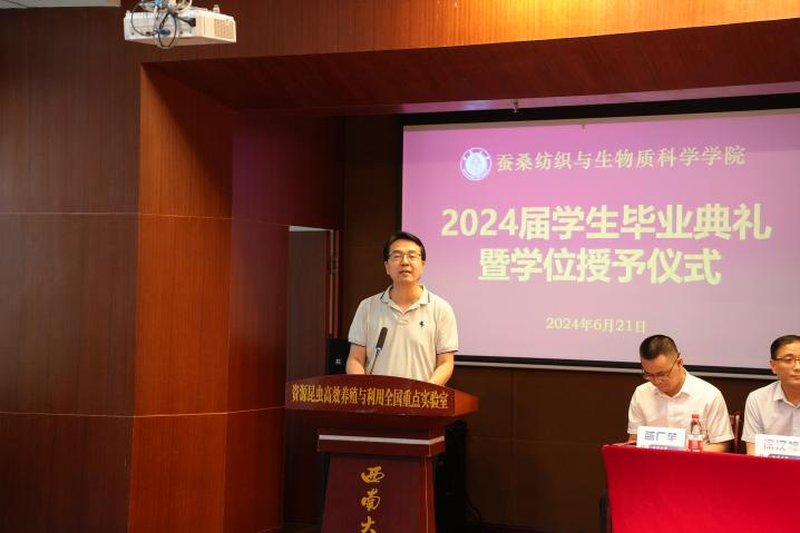 典礼在庄严的国歌声中拉开序幕。第一阶段毕业典礼上院长代方银首先致辞。他表达了对学院2024届毕业生顺利毕业的祝贺,介绍了学院在过去几年取得了显著成就,包括建成世界最大家蚕基因资源库、取得多项重大科研成果,并与国内外多家机构建立了合作关系,最后鼓励毕业生秉持“博学慎思、明辨笃行”的院训,志存高远,勇担时代重任,以实干、梦想和创新为动力,为国家和民族的繁荣做出贡献。