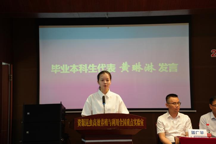 毕业生代表王灵霜、黄琳淋,在校生代表张学圆先后发言。王灵霜同学向学校、学院和老师们表达了感谢,对他们付出和指导表示敬意,同时鼓励师弟师妹保持对知识的渴望和热情,勇于面对困难,提升能力和素质,学会平衡学习与生活。黄琳淋同学回顾了四年大学生涯,表示要勇于接受平凡但不甘于平庸,通过自身努力取得了一些成绩,她还感谢了学院提供发展平台和温暖成长环境,见证学院日新月异的发展,为自己是一名蚕桑人感到自豪,对未来,黄同学表示希望同学们秉持学院精神和学习态度,在各自领域赛道上各领风骚,期待未来顶峰相见。张学圆同学以“分钟”为主题,先是回忆初入校园时第一分钟的青涩经历,接着讲述三年时光里三分钟的多彩与成长,最后提及学长学姐本科最后一分钟的斐然成就,还表示未来学弟学妹们将以他们为榜样努力前行,发言最后诚挚地送上了对学长学姐平安顺遂的美好祝福。