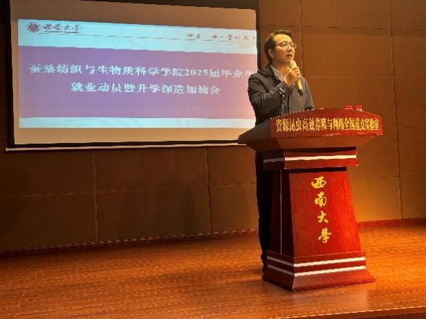 在蚕学宫一楼报告厅隆重举行2025届毕业生就业动员暨升学深造加油会。学院党委书记张袁松、党委副书记黄楠、学院副院长赵天福、副院长蓝广芊、教师代表、辅导员、毕业生代表、2025届本科生、研究生全体毕业生参加会议。会议由学院党委副书记、纪委书记朱高峰主持。