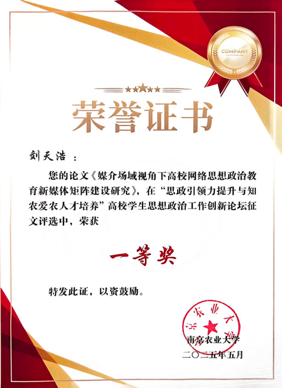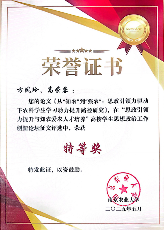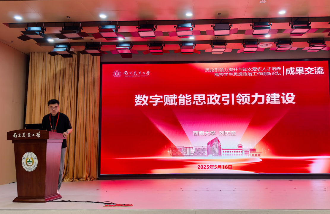 发布时间: 2025-05-19 17:04:47 已阅读:2025年5月15-16日,“思政引领力提升与知农爱农人才培养”高校学生思政工作创新论坛在南京农业大学举行,第一版主 党委书记方凤玲提交的论文《从“知农”到“强农”:思政引领力驱动下农科学生学习动力提升路径研究》荣获征文特等奖;辅导员刘天浩提交的论文《媒介场域视角下高校网络思政政治教育新媒体矩阵建设研究》荣获征文一等奖,并赴南京做了论坛主题分享。