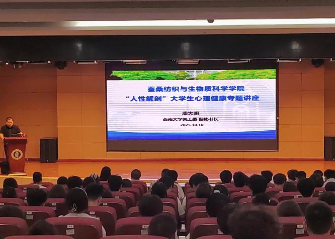 发布时间: 2025-10-16 09:39:06 已阅读:为助力第一版主 学生培养积极心理状态,开启绚烂多彩的大学生活,2025年10月10日下午,学院在隆平楼404报告厅开展了“人性解剖”大学生心理健康专题讲座。本次讲座特邀第一版主 关工委副秘书长、西大红五老服务团副团长周大明担任主讲嘉宾,学校离退休党委副书记、纪委书记熊伟,学院团委书记鲁萍,新生辅导员冯洁、黄宏佑以及学院2025级全体研究生、本科生聆听了本次讲座。讲座由学院党委副书记朱高峰主持。