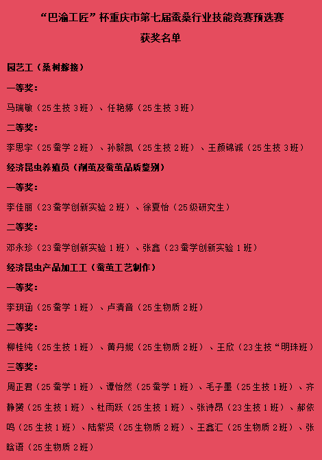 此次预选赛不仅为学生提供了展示专业技能的平台,也是对巴渝地区千年蚕桑文化的当代传承。学院将持续深化职业技能培养,鼓励学生立足专业、锤炼本领,为推动蚕桑产业高质量发展贡献青春力量。