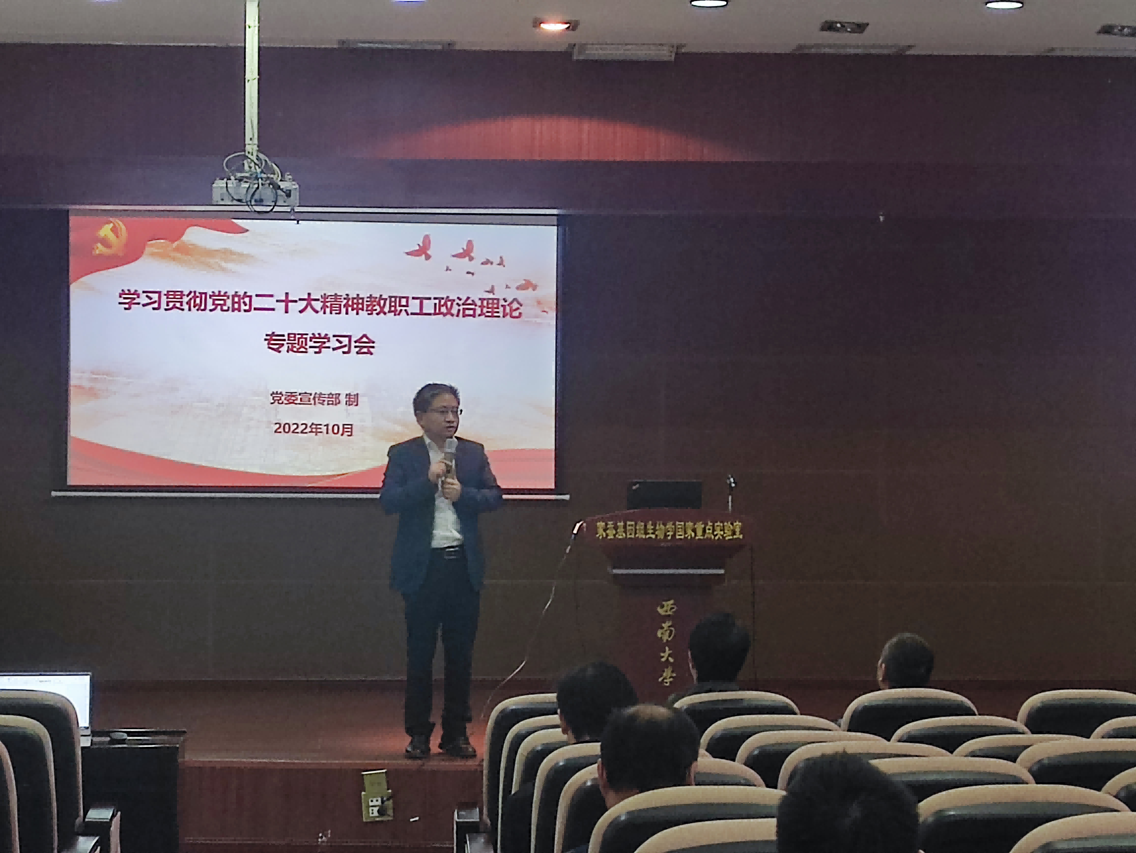 发布时间: 2022-10-31 17:44:05 已阅读:2022年10月28日下午,第一版主 党委在蚕学宫报告厅组织召开学习贯彻党的二十大精神教职工政治理论专题学习会,会议由学院党委书记张袁松主持。