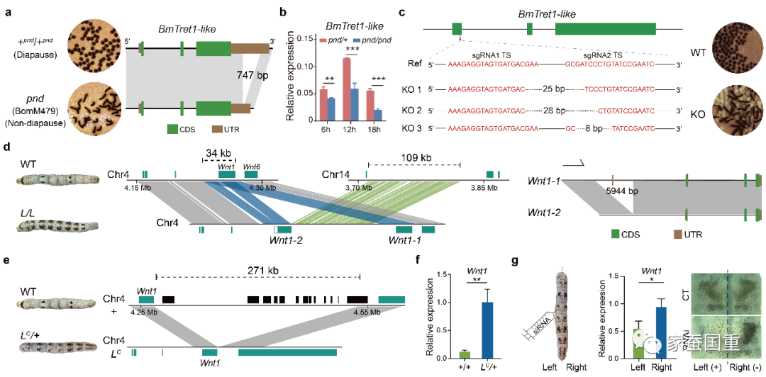 滞育是昆虫中常见的一种生态适应性性状,它能确保昆虫顺利躲过不利于生存的环境条件。虽然滞育激素早在1957年于家蚕中首次被发现(Nature, 1957),但至今关于胚胎滞育基因的信息却很少。本研究中,基于家蚕“着色非滞卵”突变体(pnd)和基因组结构变异分析,并通过基因编辑进行功能验证,揭示了BmTret1-like基因是重要的胚后滞育决定因子。这是昆虫中首次鉴定出胚后滞育决定基因。