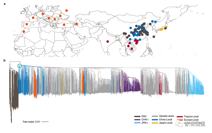 图2. 家蚕和野桑蚕材料的地理分布和系统发生关系