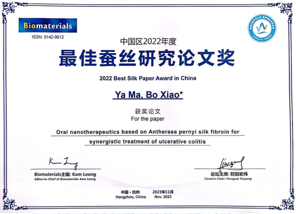 博士生马雅/肖波教授获2022年度Biomaterials中国区最佳蚕丝论文奖
