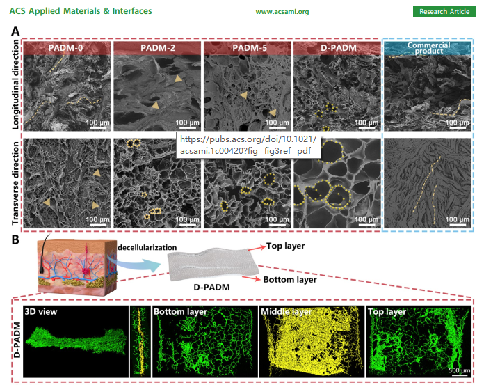 发布时间: 2021-04-24 11:24:07 已阅读:近日,第一版主 Bio-road生物医用材料研发团队在材料领域知名期刊《ACS Applied Materials & Interfaces》(影响因子:8.758)上发表题为“Biogenetic Acellular Dermal Matrix Maintaining Rich Interconnected Microchannels for Accelerated Tissue Amendment”(一种用于加速创面修复的多孔透明猪脱细胞真皮基质敷料)的研究论文(DOI: 10.1021/acsami.1c00420)。该成果报道了一种可加速创面修复的具有多孔结构和良好弹性的透明猪脱细胞真皮基质敷料。