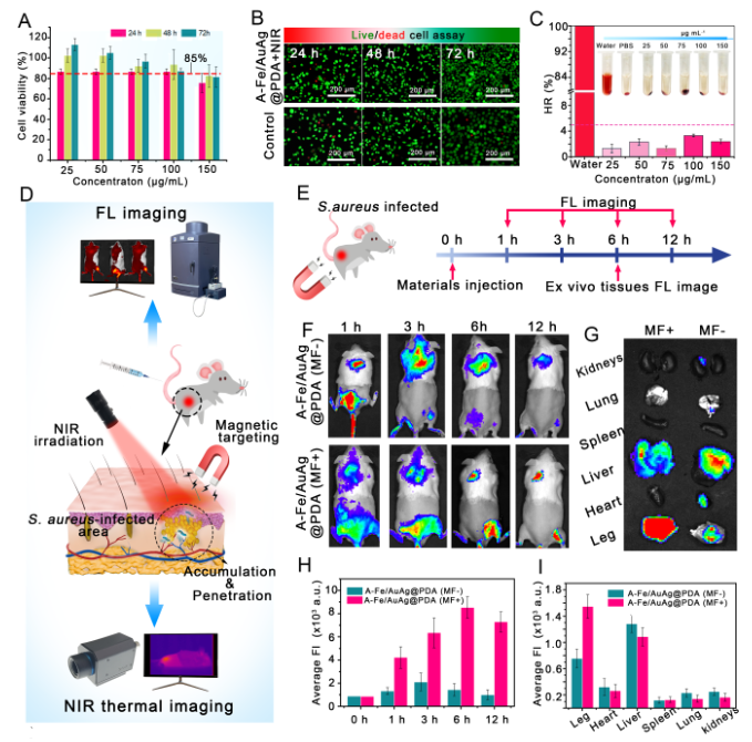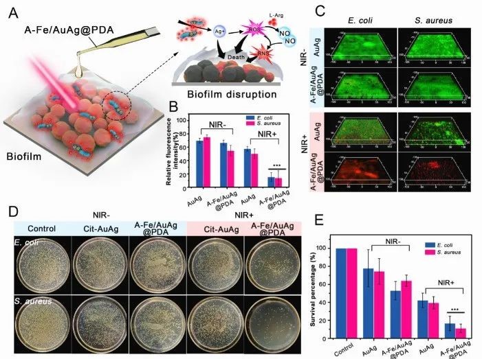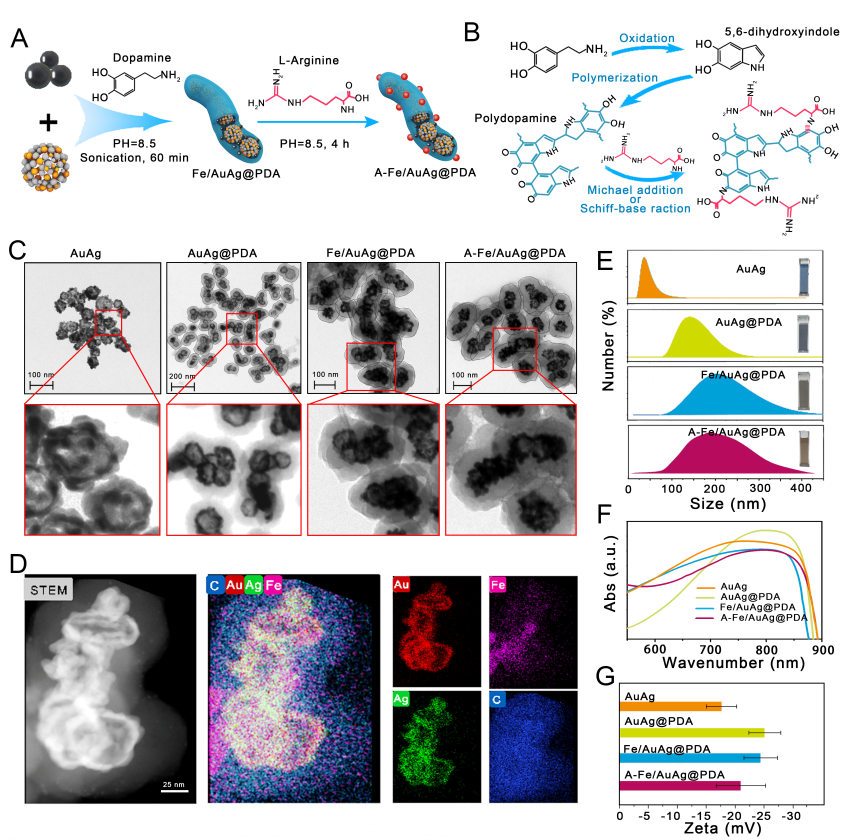 为解决上述问题,本研究设计了一种具有核壳结构的蠕虫状纳米递送系统(长径/短径:186.2 ± 54.4 nm/119.3 ± 21.1 nm)。其核心为负载了纳米氧化铁的金/银笼(Fe2O3-AuAg NPs),其壳层为精氨酸修饰的聚多巴胺(A-PDA)涂层。在应用过程中,该纳米蠕虫通过外部磁场靶向生物膜感染部位,由近红外激光照射产生局部高热,触发活性活性氧与精氨酸之间的级联催化反应,原位释放NO气体,实现光热动力学、化学动力学及NO气体高效协同抗菌。