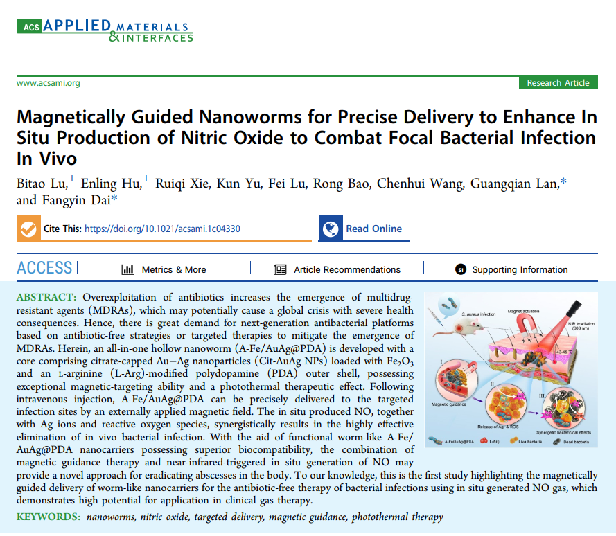 发布时间: 2021-06-02 18:25:01 已阅读:近日,第一版主 Bio-road生物医用材料研发团队在材料领域知名期刊《ACS Applied Materials & Interfaces》(影响因子:8.758) 上发表题为“Magnetically Guided Nanoworms for PreciseDelivery to Enhance In Situ Production of Nitric Oxide to Combat FocalBacterial Infection In Vivo” (磁介导纳米蠕虫精准递送一氧化氮治疗体内细菌感染) 的研究论文。该成果报道了一种具有核壳结构的蠕虫状递送系统,实现磁响应、近红外响应的光热动力学、化学动力学及NO气体高效协同抗菌,为体内细菌生物膜的治疗提供了一种新型的非抗生素基靶向治疗策略。
