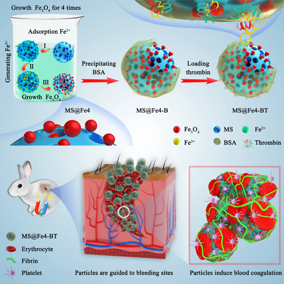 为解决上述问题,本研究首次设计了一种具有磁响应功能的智能止血材料,用于向环境复杂的出血创面递送止血材料。在该研究中,通过原位生长法在微孔淀粉表面生长磁性纳米Fe3O4簇,通过牛血清蛋白媒介负载凝血酶后获得了具有磁定位能力的智能止血材料。在应用过程中,该智能止血材料通过外部磁场靶向创面内部的出血点,由止血材料自身的凝血功能,触发血液的凝固效应,并协同人体的凝血机制,实现出血创面的高效止血。