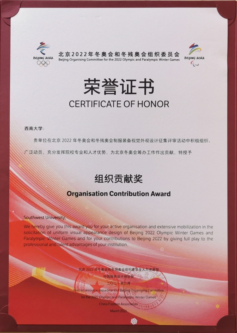 学校获得北京2022年冬奥会和冬残奥会制服装装备视觉外观设计组织贡献奖,充分体现出学校“特立西南,学行天下”的大学精神,彰显出学院“立足西南、服务全国、面向世界”的办学目标。