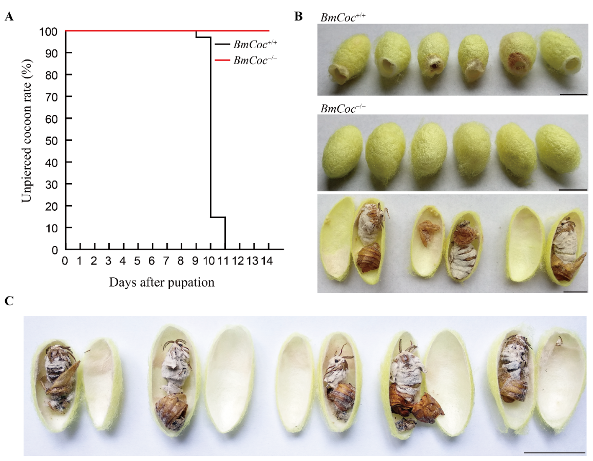 课题组通过生物信息学分析揭示,溶茧酶为鳞翅目昆虫特有,且在其获得结茧能力之前该基因就已经存在,它在进化中经历纯化选择,并在结封闭茧的鳞翅目昆虫中选择作用更为强烈。研究人员以家蚕为结封闭茧的鳞翅目昆虫模式,利用CRISPR/Cas9系统敲除溶茧酶基因,建立了该基因的敲除突变系,其纯合突变体能顺利完成全生命周期并存活,但其成虫(蛾)因丧失溶茧的能力而不能“破茧而出”,困在茧中自然死亡。这是首次以实验和表型证据表明,溶茧酶是破茧的决定因素。这一发现提示,对于结封闭茧的鳞翅目害虫,可以通过溶茧酶的失活或基因驱动策略控制害虫数量。