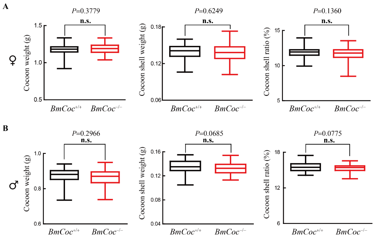 课题组的研究表明,溶茧酶基因只在蛹后期至蛾期表达,敲除溶茧酶基因的纯合突变体,不仅不影响繁殖力、孵化率、生长发育,也不影响蚕茧产能和品质,困在茧内的蚕蛾也不在茧内产卵,蛾体死亡后逐渐呈干瘪状。因此,不仅可以延迟收茧,也无需高温烘烤或冷冻,蚕茧即可长时间储存。而在繁殖环节,按照正常蚕种生产流程削茧鉴蛹(分选雌雄),敲除系制种过程与普通家蚕品种完全相同。基于此,作为一种新的育种材料,经过进一步的评价和选育改良及辅之相关配套技术,必将给蚕茧生产和缫丝工业带来重大创新,推动传统茧丝生产工艺实现“颠覆式”进步,即从品种源头实现“免烘茧”,省工序、节能源、减排放、少投入;也解决“收茧大战”问题,避免“不得不卖”和“压级压价”,更好地保护蚕农利益。