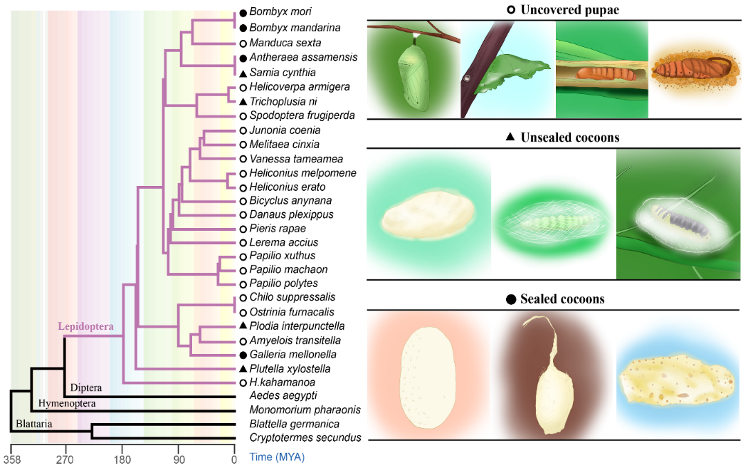 许多昆虫以自身结茧来保护其变态发育,在“茧宫殿”中化蛹和羽化,可以免于或减轻不利环境和捕食者的侵害。自然界中,结封闭茧的昆虫,变态为成虫后必须“破茧成蝶”,才能行使交配和完成产卵继代。此前的研究认为破茧过程有溶茧酶(cocoonase)参与,但它是否起到决定性作用,则尚无研究报道。