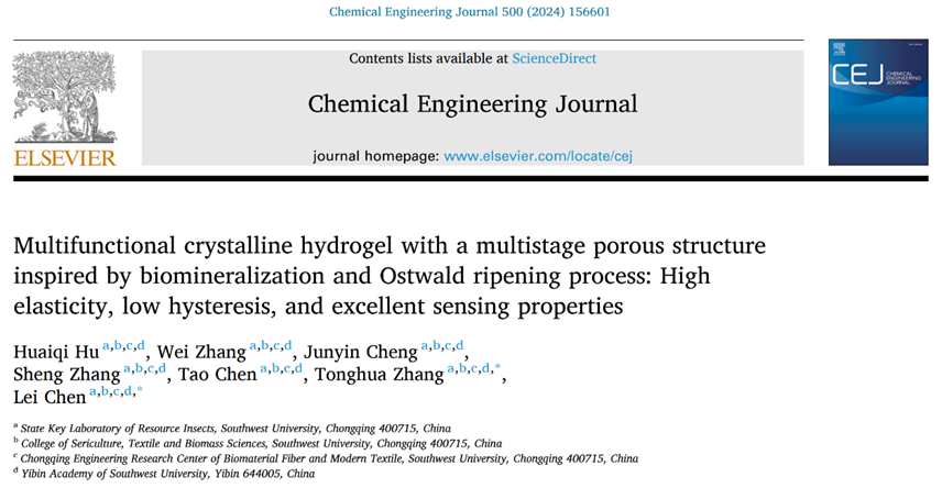 发布时间: 2024-10-19 13:48:08 已阅读:近日,第一版主 张同华教授和陈磊副教授课题组在化学工程领域知名期刊《Chemical Engineering Journal》(IF:13.3)发表了题为“Multifunctional crystalline hydrogel with a multistage porous structure inspired by biomineralization and Ostwald ripening process: High elasticity, low hysteresis, and excellent sensing properties”的研究论文。