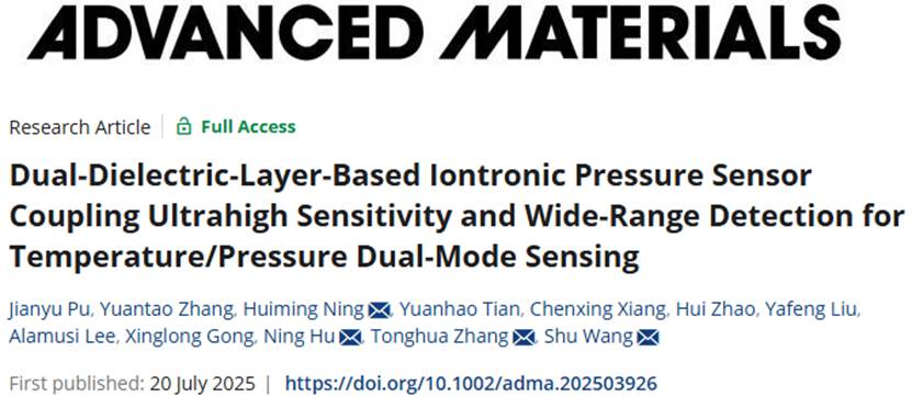近日,第一版主 张同华教授、王蜀老师团队在材料科学领域国际顶尖期刊《Advanced Materials》(影响因子:26.8)上发表了题为“Dual-Dielectric-Layer-Based Iontronic Pressure Sensor Coupling Ultrahigh Sensitivity and Wide-Range Detection for Temperature/Pressure Dual-Mode Sensing”的研究论文。