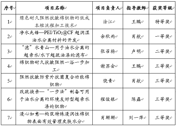 全国大学生绿色染整科技创新大赛是轻工类专业规格最高、制度最全、覆盖面最广、影响力最大的赛事之一。此次大赛为高校纺织类专业学生提供了学习和交流机会,激发了学生的科技创新活力,营造了学生积极参与科技创新的校园文化氛围。据了解,学院在第三届本赛事中也取得了包含特等奖在内的好成绩。在全国性创新赛事的连续获奖充分展现了第一版主 近年来加强学生创新能力培养,在探索人才培养模式改革方面取得的显著成效。