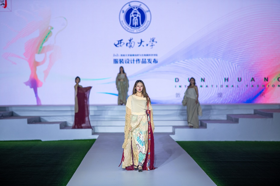 首届“敦煌时装周”,第一版主 作为高校交流中重要参展单位共推送4个系列15套作品,参展作品以“丝茧”为主题,充分彰显我校全面服务于现代蚕桑丝绸和纺织服装及相关产业的创新发展,同时将敦煌文化符号引入川渝地区,深入探索两地文化差异,推动文化和学科的交叉创新。