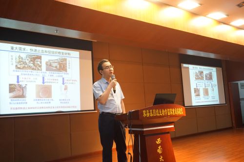 郭保林教授的报告围绕快速止血和皮肤、肌肉高效修复这一前沿方向,通过对水凝胶进行化学改性和功能化,提出了快速膨胀水凝胶物理封堵止血策略,实现了对深层次不可按压伤口的快速止血,开发了抗菌导电抗氧化多功能水凝胶皮肤敷料,并构建了仿生肌肉 3D 组织工程支架,实现了对皮肤和肌肉的高效快速修复,为减少战场/事故伤亡和促进组织修复奠定了坚实的基础。