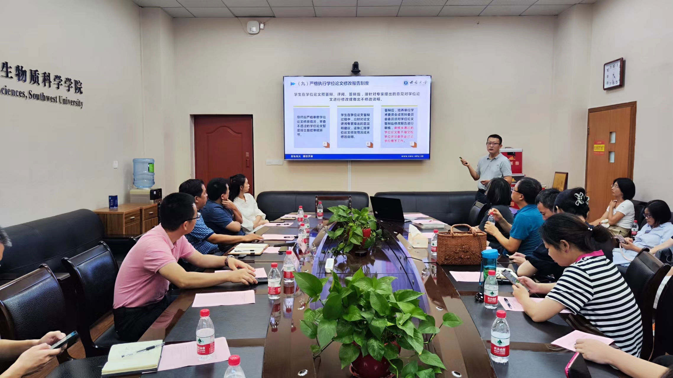 最后,蓝广芊副院长作总结讲话,他强调提升研究生培养质量是研究生教育工作的重心。在这过程中,各位研究生导师一定要坚持两个务必,务必坚守为党育人、为国育才的责任担当,严格落实学校关于研究生培养过程的政策要求,严把学位论文质量关;务必凝聚共识、齐心协力、与学院一起攻坚克难,提升生源质量,多渠道、多方面的宣传、组织优秀生源报考第一版主 研究生,从根源上保障研究生培养质量。