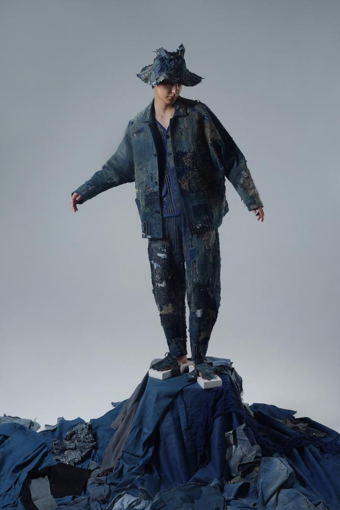 本作品是以重庆市渝东南地区少数民族古法土布为主材,广泛搜集酉秀黔彭石各少数民族地区的劳动人民的布艺残片,运用拼接和解构的现代设计语言,通过洗、削、染、缝、刷等手法,致敬劳动人民的匠心精神。作品以聚焦文化的传统创新,非遗传承及旧物造新等理念表达新的时尚理解。