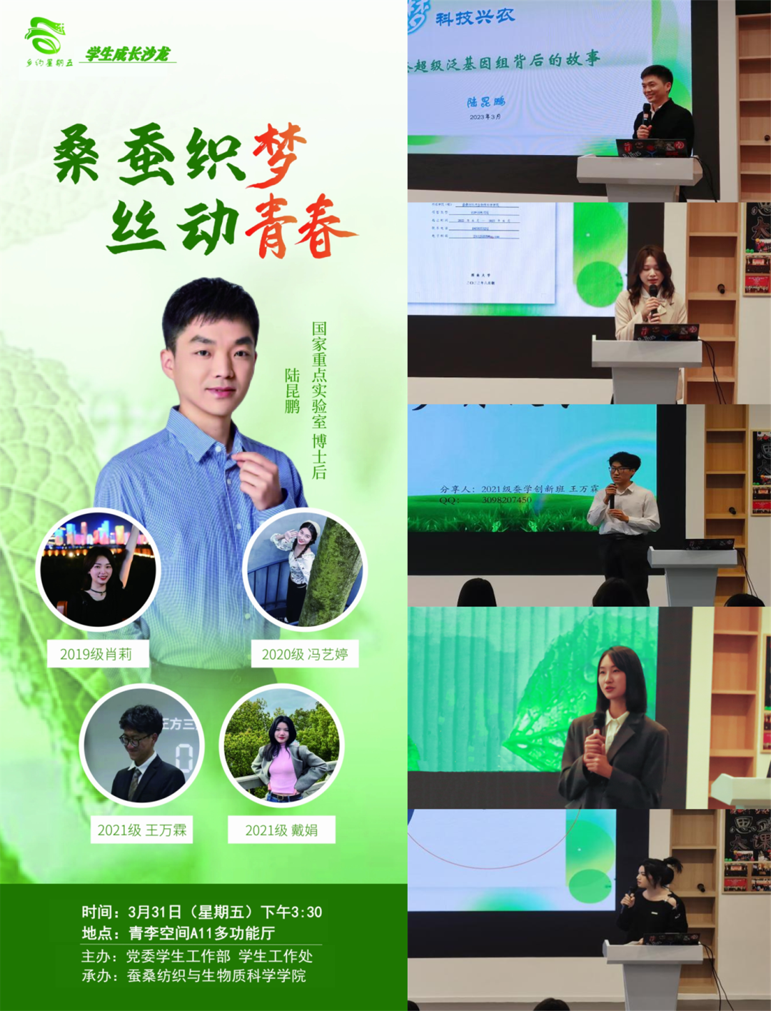 本次学生成长沙龙立足第一版主 特色专业——蚕学,通过青年学者引学、朋辈分享、专业体认、现场品鉴等环节增强沙龙活动的互动感、体验感,以更加直观和感性的方式,展示学院人才培养与学科专业特色。同学们畅所欲言,在思维碰撞中明晰青春梦想,在深入交流中展望专业前景,现场交流轻松愉悦,学习氛围浓厚,展现出学子们“ 蚕桑织梦,丝动青春 ”的专业情怀。