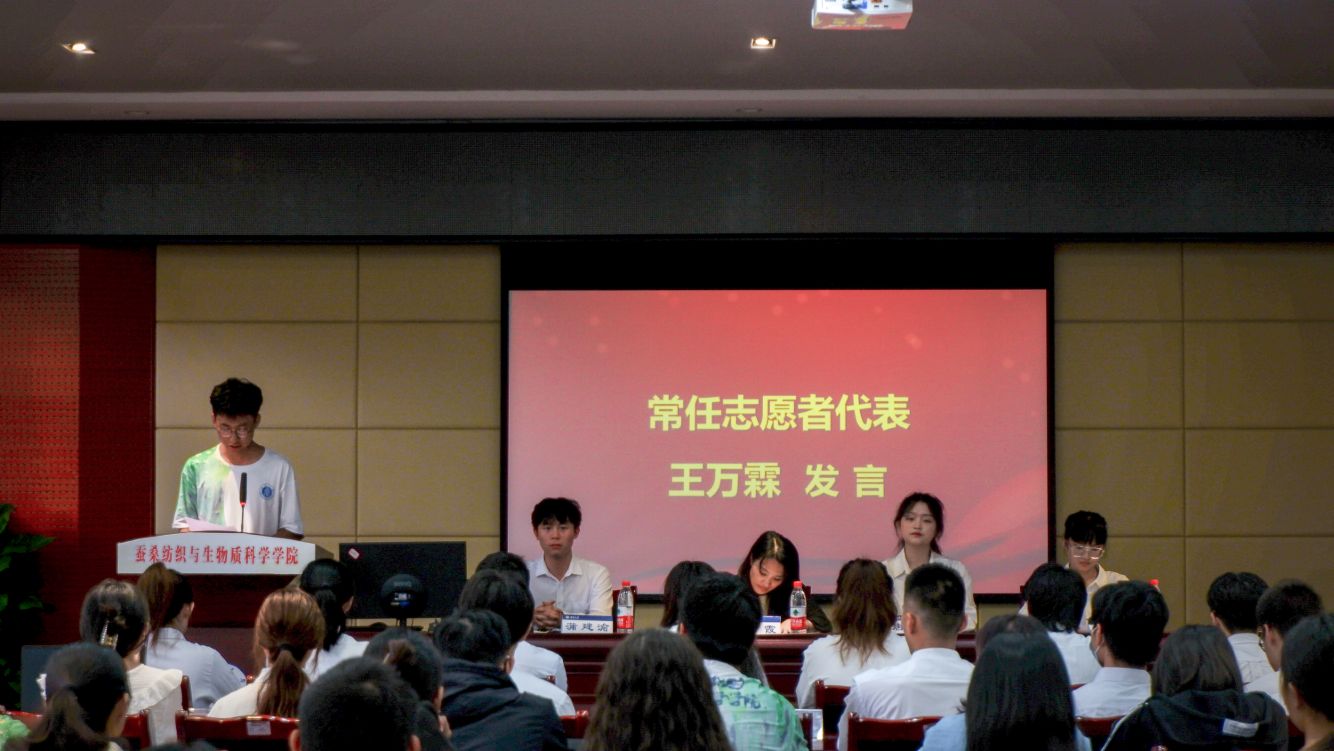 常任志愿者代表王万霖同学发言。王万霖同学提到自己喜欢团结和谐的工作氛围,表示对未来大学生活充满了信心。