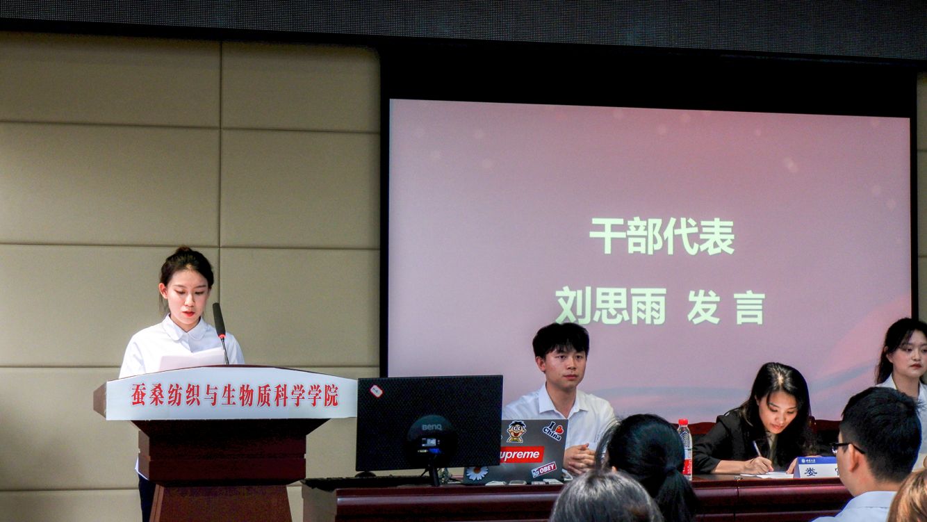 干部代表刘思雨同学发言。刘思雨同学表达了自己加入团委学生会的激动之情,并为新一届团委学生会成员立下了踏踏实实做事和合理平衡工作与学习两个目标。