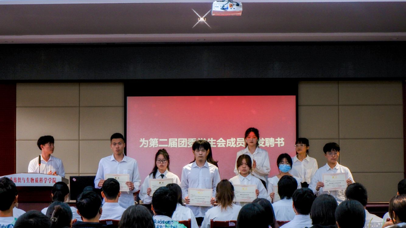 团委书记娄霞,团委副书记蒲建渝,执行主席宋静,主席唐文涵,为第二届团委学生会成员颁发了聘书。