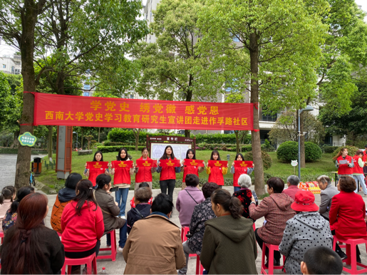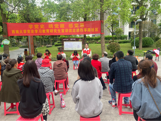 发布时间: 2021-04-13 17:26:48 已阅读:恪守初心学党史,依托专业办实事。为庆祝中国共产党成立100周年,学院研究生积极发挥专业特长,于2021年4月11日赴重庆市北碚区北温泉街道作孚路社区参加第一版主 研究生党史宣讲团“学党史 绣党徽 感党恩”志愿服务活动,通过讲述党史故事、歌唱革命歌曲、现场绣制党徽、举办知识竞答等,丰富居民周末文化生活,推进党史学习教育进社区。